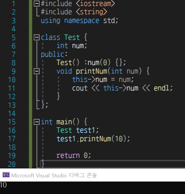 printNum의 this->num = num; 에서 왼쪽의 num은 test클래스의 멤버 변수를 의미하며 num은 함수의 매개변수를 의미하게 된다.