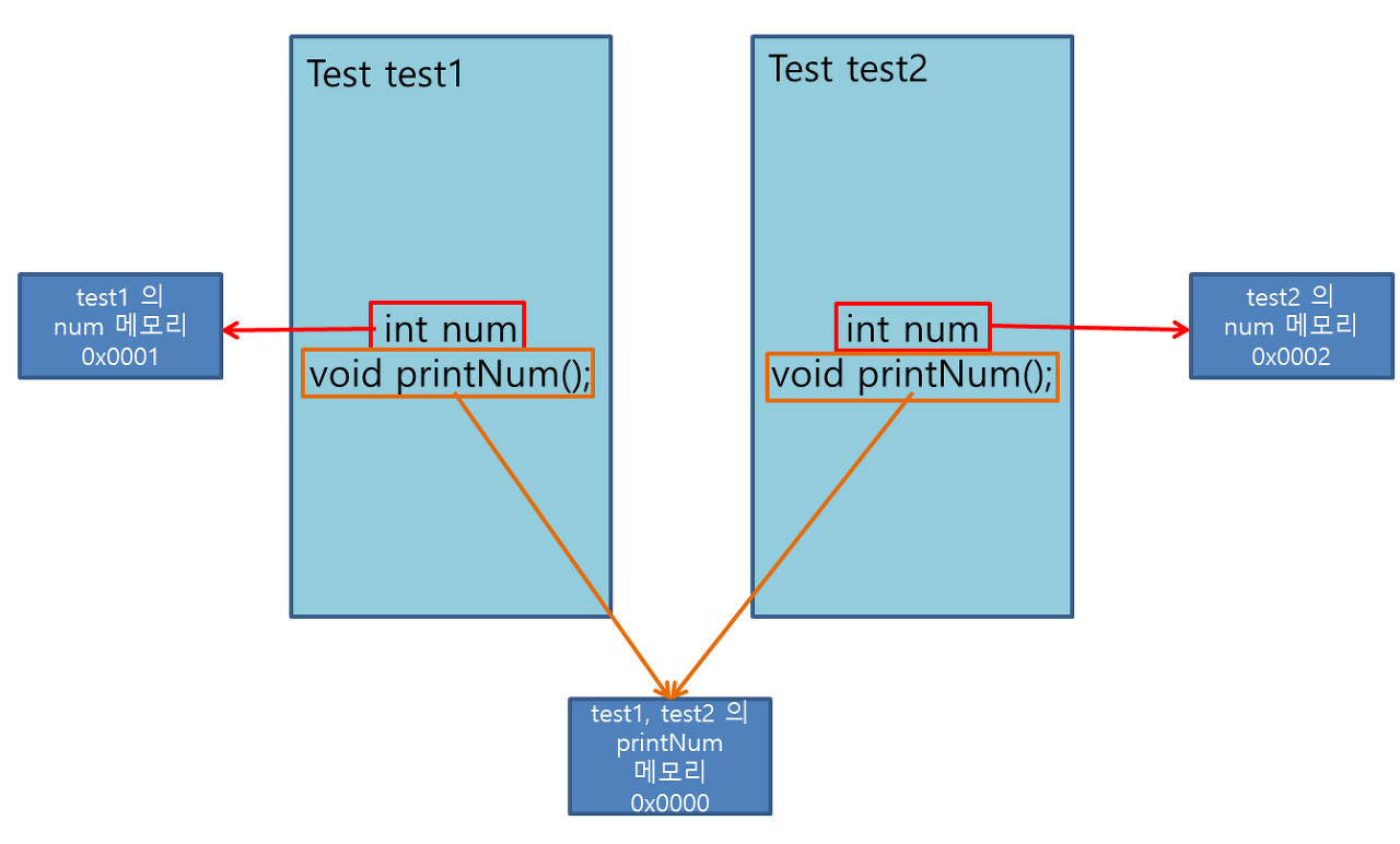 예를 들어 Test라는 클래스가 존재하는데 test1, test2라는 두 개의 클래스를 생성했다고 하면 멤버변수 num은 test1, test2 각각 독립된 메모리를 할당받지만 멤버 함수 printNum은 메모리 주소를 공유하고 있기 때문에 printNum을 호출할 경우 어떤 객체에서 호출하였는지 알기 어렵다. 이러한 문제를 해결하기 위해 등장한 것이 this 포인터이다.