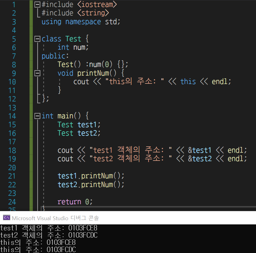 Test class를 간단하게 생성하여 객체의 주소와 해당 멤버 함수가 가진 this 포인터의 주소를 비교해보면 해당 멤버 함수를 호출한 객체의 주소를 가지고 있음을 확인할 수 있다.