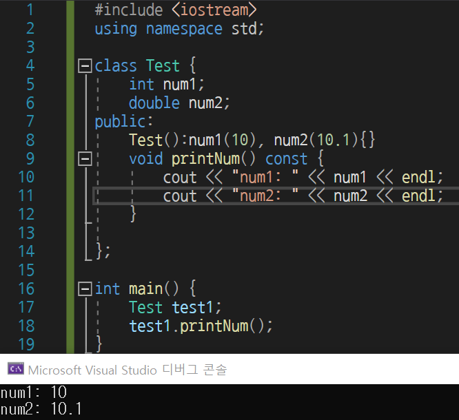 으로 초기화가 진행되어 좀 더 뛰어난 성능을 발휘할 수 있다. 또한 이와 같은 이유로 const 멤버와 레퍼런스의 경우 생성과 동시에 초기화되어야 하기 때문에 이니셜라이저를 통해 초기화해야 한다.