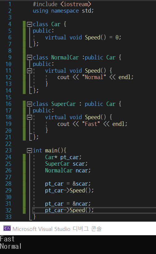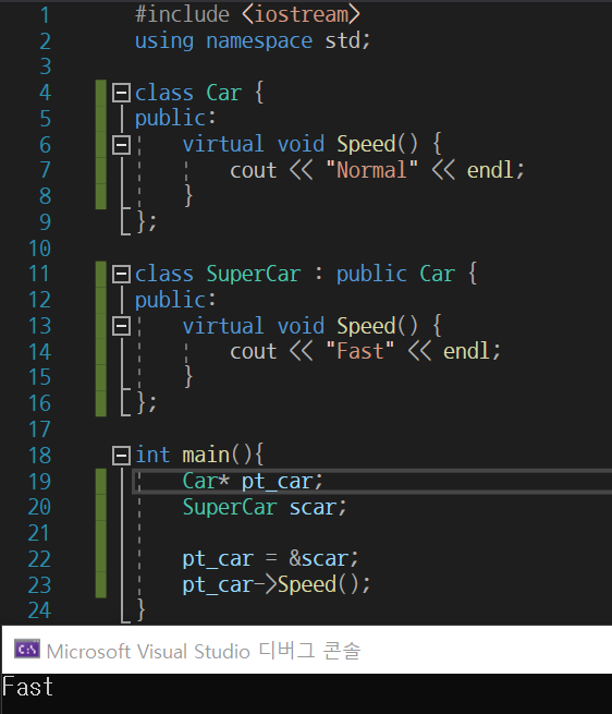 일반 가상 함수를 통해 Speed라는 함수가 자식클래스에서 재정의되어 사용될 수 있다고 알려주기 때문에 Car 타입의 포인터 변수로 scar 객체의 주소를 담아 사용하면 해당 객체의 메소드를 사용할 수 있게 된다.