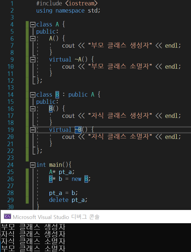 그러므로 동적 할당을 사용하고자 하면 반드시 소멸자도 가상 함수로 선언해 자식 클래스의 소멸자도 호출될 수 있도록 해주어야 한다.