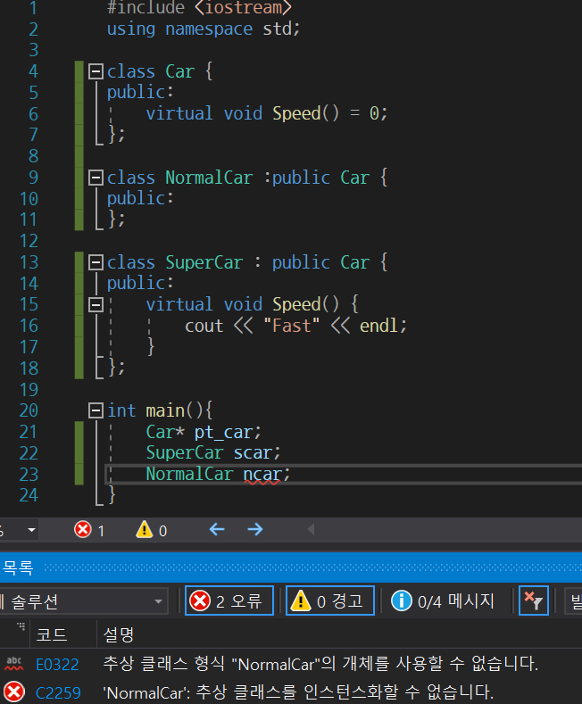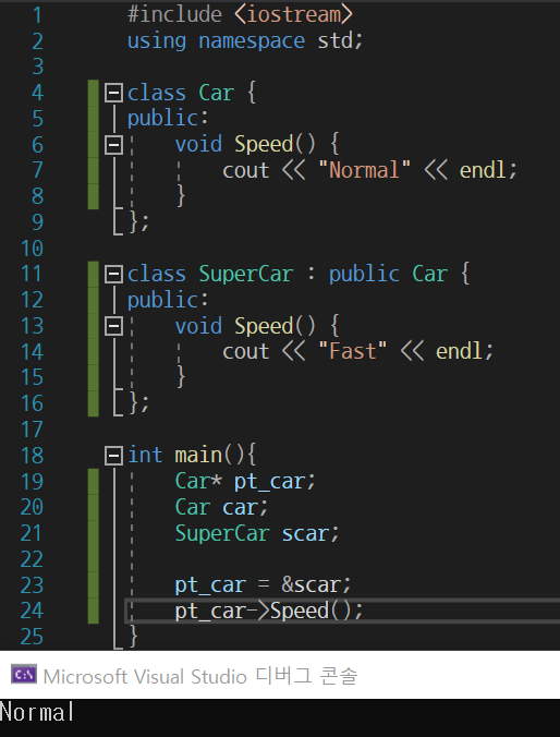 Car 클래스와 SuperCar 클래스를 선언하고 Car 클래스 타입의 포인터 변수에 SuperCar 클래스로 만든 객체의 주소를 담아주면 SuperCar의 Speed() 함수를 호출할 것 같지만 그렇지 않고 포인터 타입에 해당하는 클래스의 함수를 호출하는 것을 확인할 수 있다. 이를 해결하기 위해 가상 함수를 사용한다.