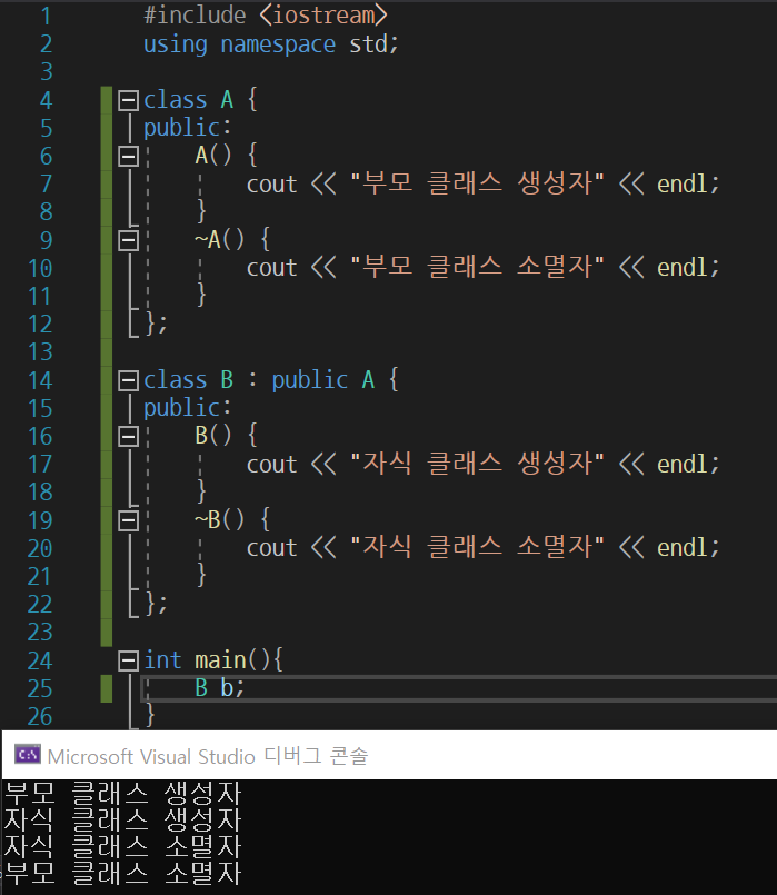 자식 클래스 객체를 생성하면 먼저 부모 클래스의 멤버가 전달되어야 하므로 부모 클래스의 생성자가 호출되고 그 다음 자식 클래스의 생성자가 호출된다. 소멸자는 자식 클래스가 먼저 호출되고 그 다음 부모 클래스의 소멸자가 호출된다.