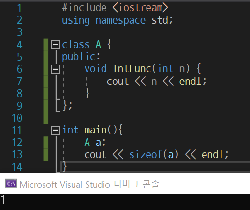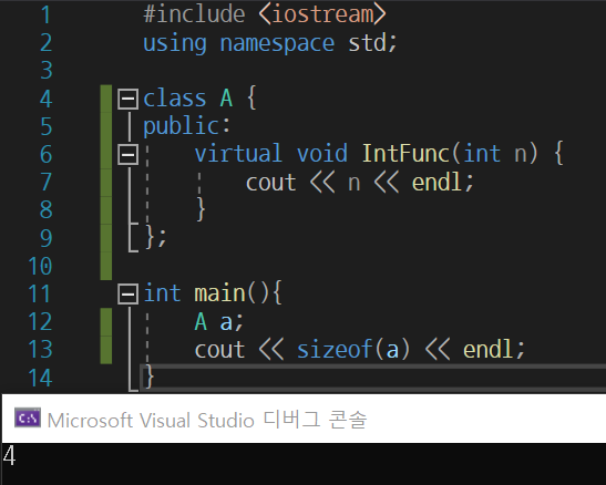 간단한 클래스 A를 생성하는데 하나는 일반 멤버 함수인 경우이고 다른 하나는 멤버 함수를 virtual로 선언하였다. 그때 해당 클래스로 생성한 객체의 메모리 크기를 보면 동일한 함수를 사용했는데 다른 것을 확인할 수 있다. 이는 virtual로 선언된 함수가 있을 경우 동적 바인딩을 진행해야 할 수 있기 때문에 프로그램 실행 시 따로 함수의 메모리 주소를 함수 호출 전에 미리 담아놓을 가상 함수 테이블(virtual function table)을 생성하고 해당 테이블을 가리키는 포인터를 만들기 때문이다. 가상 함수 테이블에 해당 클래스의 가상 함수들의 주소가 담기게 되고 가상 함수를 호출하게 되면 테이블에 접근해 필요한 함수의 주소를 찾아 호출하게 된다.