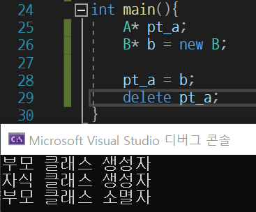 소멸자도 자식 클래스에서 오버라이딩된 함수라고 볼 수 있기 때문에 만약 부모 포인터로 객체를 이용하고 소멸자가 호출되면 부모 클래스의 소멸자만 호출된다.