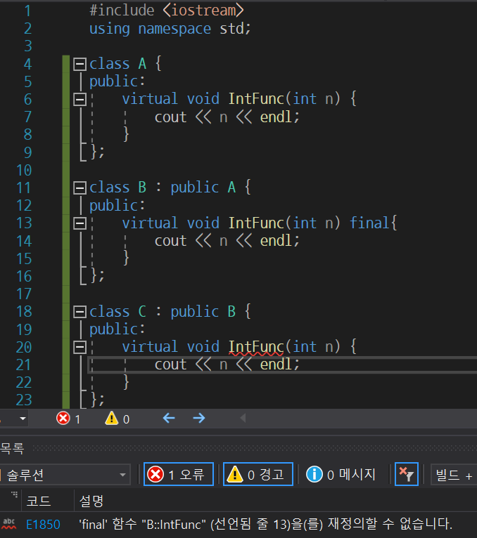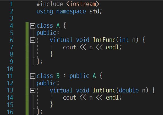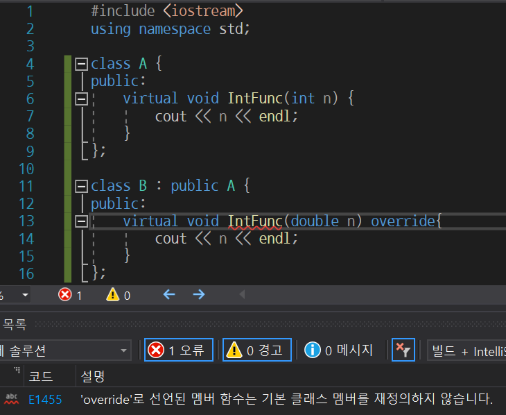 만약 B 클래스가 A 클래스를 상속받아 IntFunc라는 함수를 오버라이딩하려고 했는데 매개변수를 int가 아닌 double로 사용했다고 하자. 그럼 함수가 오버라이딩 되지 않지만 문법적으로 아무런 문제가 없기 때문에 오류가 발생하지 않는다.