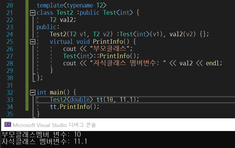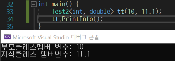 부모 클래스의 타입을 정하여 상속하고 싶다면 상속할 때 class Test2 :public Test<int>처럼 템플릿 인수를 정해 상속시켜주면 된다.