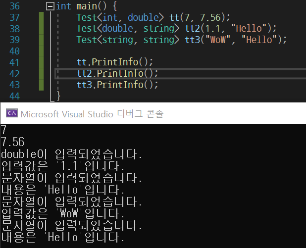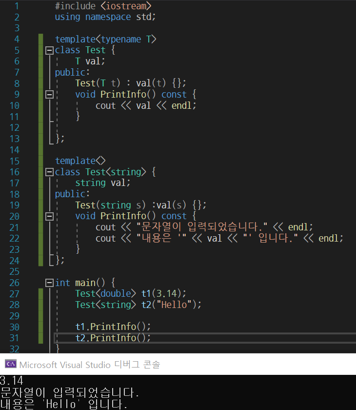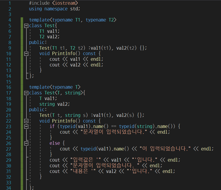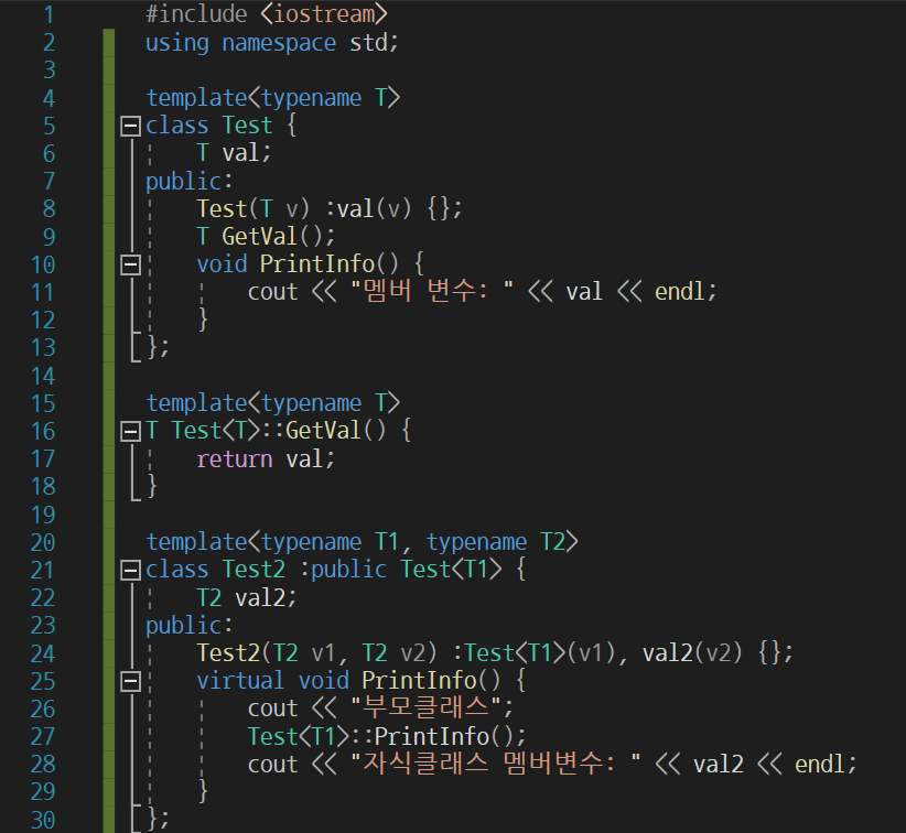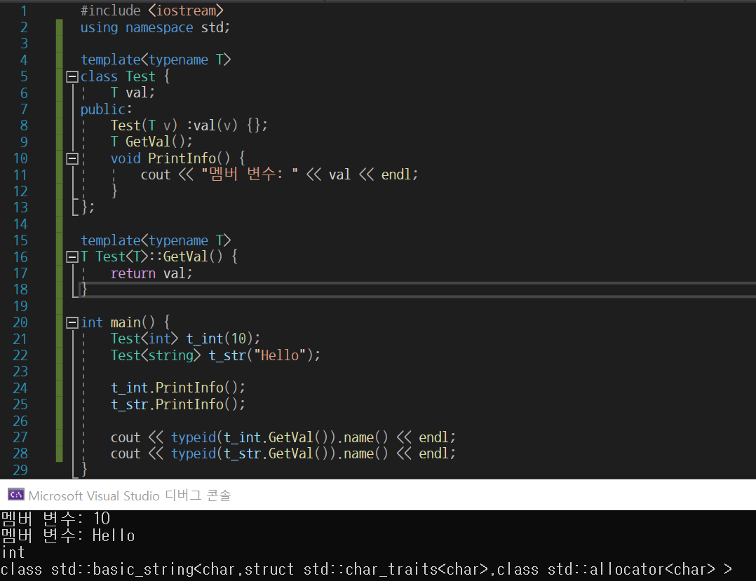 멤버 변수 val과 멤버 함수 GetVal, PrintInfo를 가지는 간단한 클래스 템플릿을 생성했다. 멤버 함수를 클래스 외부에서 정의할 경우 임의의 타입 T를 정의해 주어야 하기 때문에 template<typename T>를 적어주어야 하며 범위 연산자를 통해 어떤 클래스의 연산자인지 표현해줄 때도 T Test<T>::GetVal()로 클래스에 명시해주어야 한다.