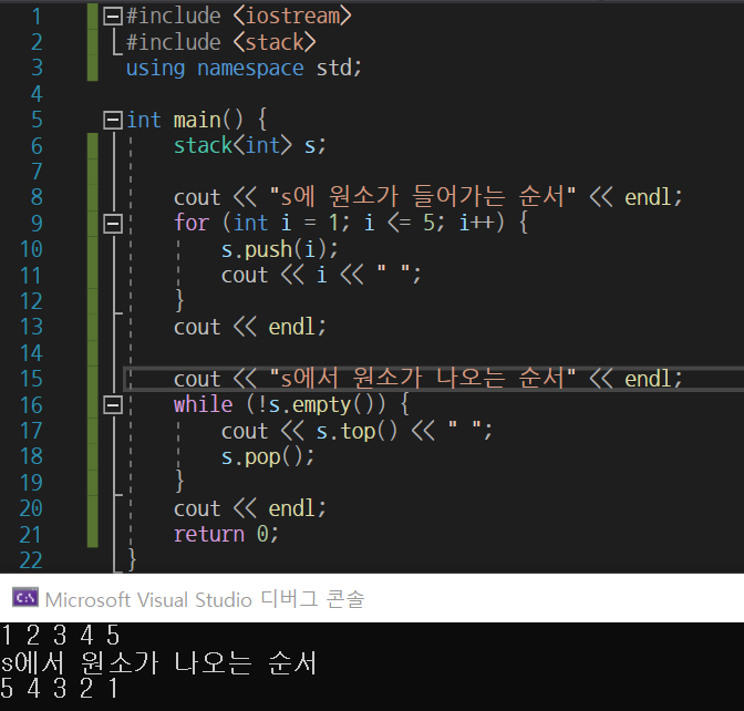 간단한 예시로 스택의 구조와 멤버 함수를 확인해보면