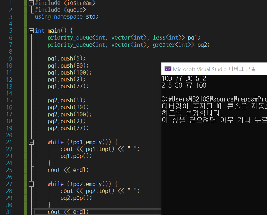 비교연산자에는 less<자료형>, greater<자료형>이 있다. less는 내림차순으로, greater은 오름차순으로 출력된다. default는 오름차순이다.