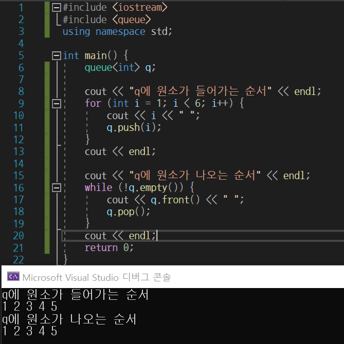 q.pop() : q의 맨 앞에 위치한(가장 먼저 저장된) 원소를 삭제(FIFO 이므로)