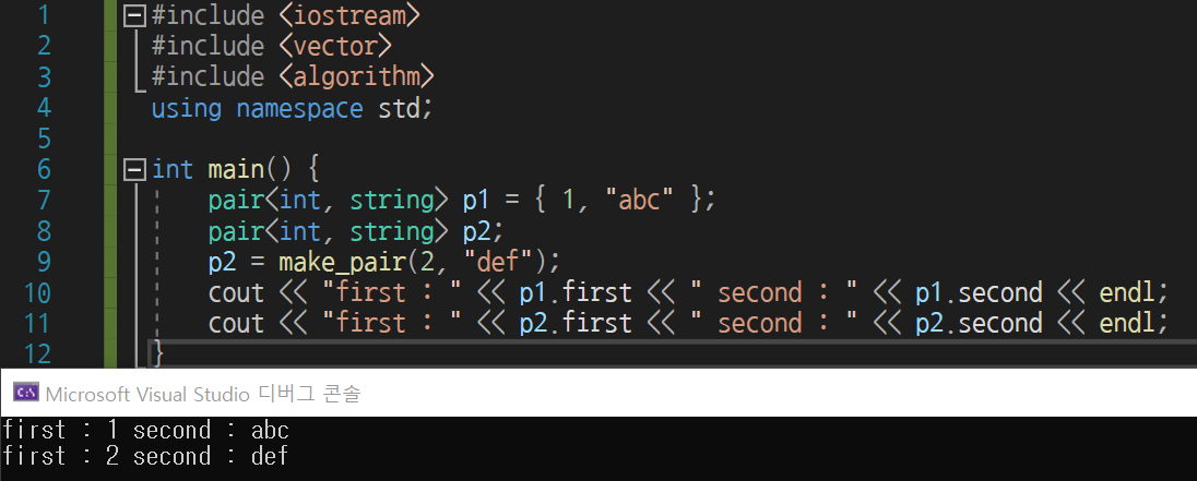 #include <utility> 헤더 파일에 존재하는 STL이지만 algorithm, vector과 같은 헤더파일에서 이미 include 하고 있기 때문에 따로 utility를 include 하지 않아도 사용 가능하다.