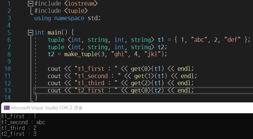 헤더파일 #include <tuple>을 선언해야 한다.
