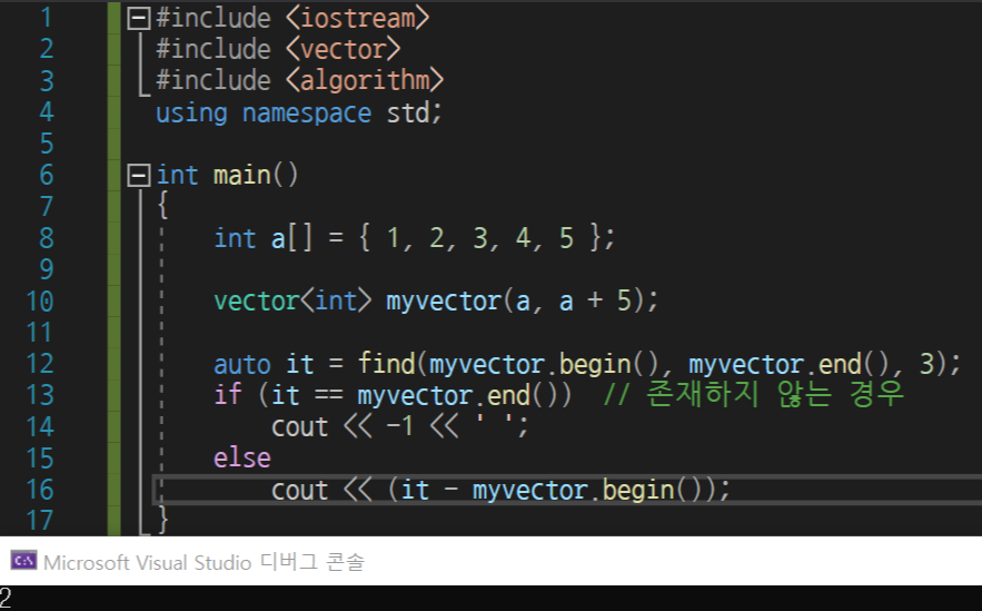 범위 안에 원하는 값을 찾는다. first부터 last 전까지의 원소들 중 val과 일치하는 첫 번째 원소를 가리키는 반복자를 리턴한다. 만약 일치하는 원소를 찾지 못할 경우 last를 리턴한다.