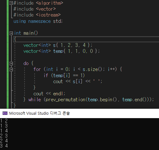 next_permutation을 사용하면 오름차순으로 정렬되기 때문에, 조합은 내림차순으로 출력된다. 하지만 prev_permutation을 쓰면 모든 조합의 경우의 수를 오름차순으로 출력할 수 있다.