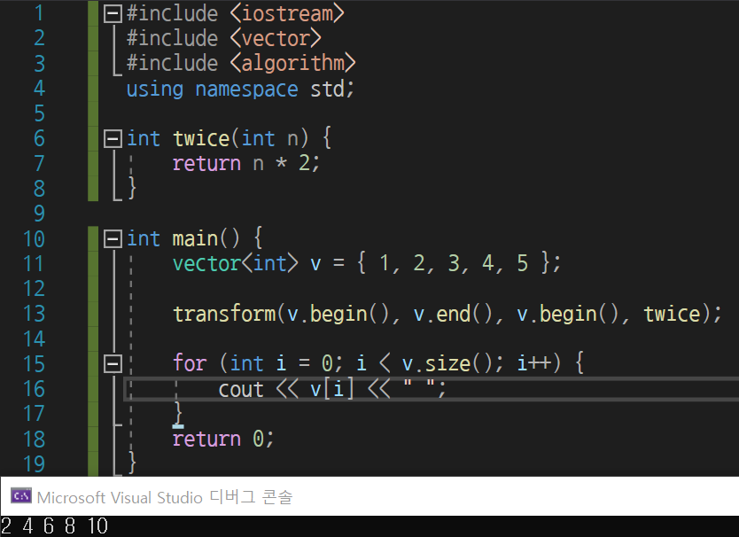 - transform의 경우 원소를 수정하게 된다. 함수의 리턴값으로 해당 원소가 바뀐다.