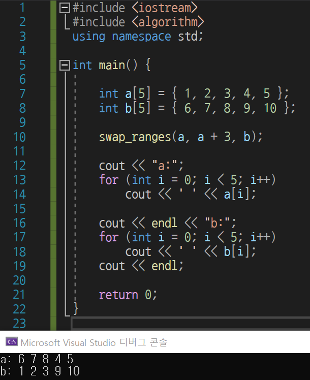 swap_ranges는 특정 범위의 값들을 다른 연속된 메모리 공간의 값들과 바꾸어 주는 역할을 한다.