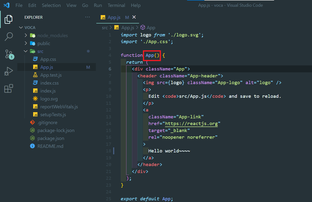 현재는 App이라는 컴포넌트 하나만 있는 상태이다. App 컴포넌트는 함수로 만들어져 있다. 이렇게 함수로 만들어진 컴포넌트를 함수형 컴포넌트라고 한다. 모든 컴포넌트는 대문자로 시작해야 한다.