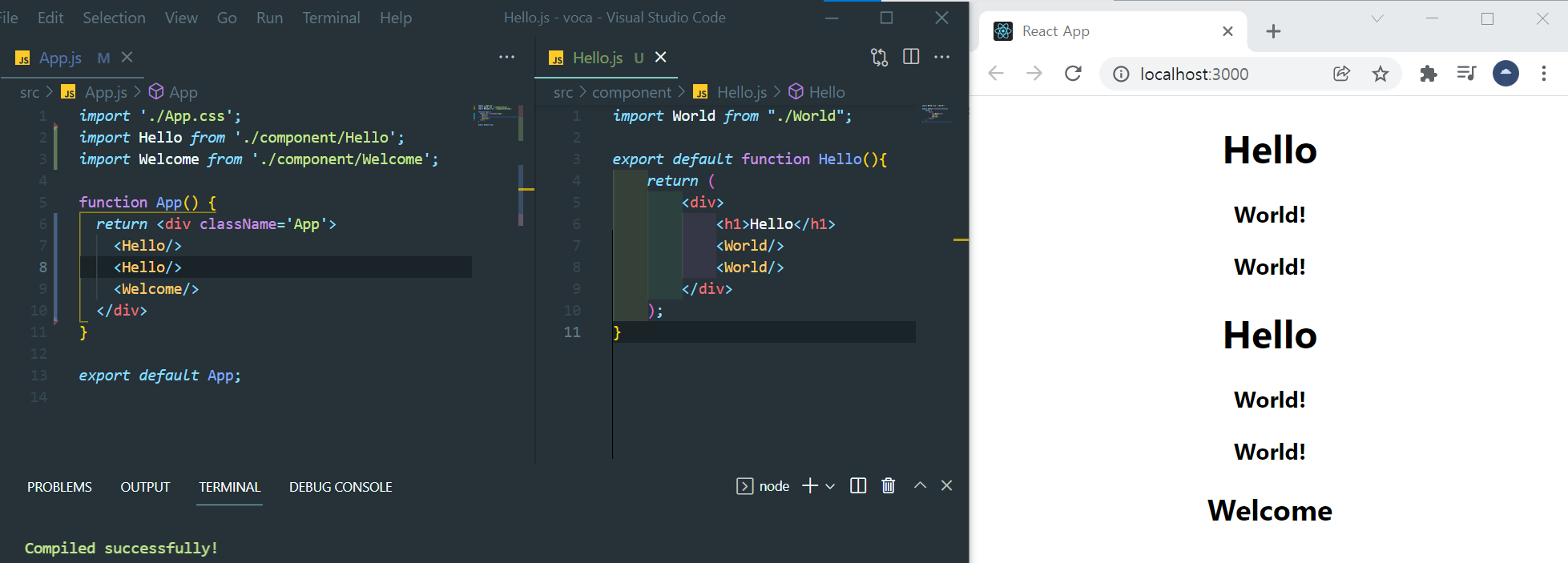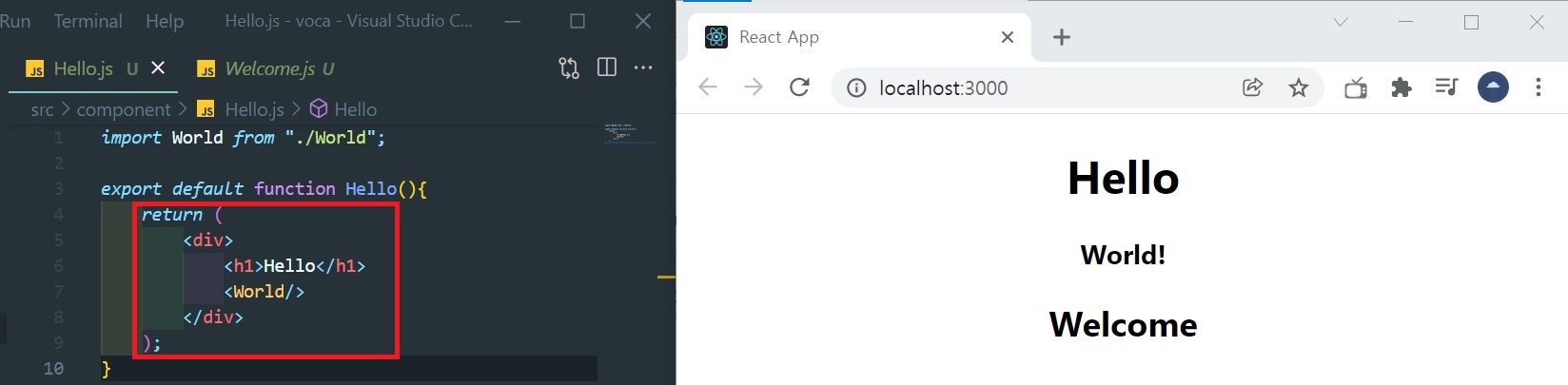 World 컴포넌트를 만들고 Hello 컴포넌트 안에서 World 컴포넌트를 import 했다.