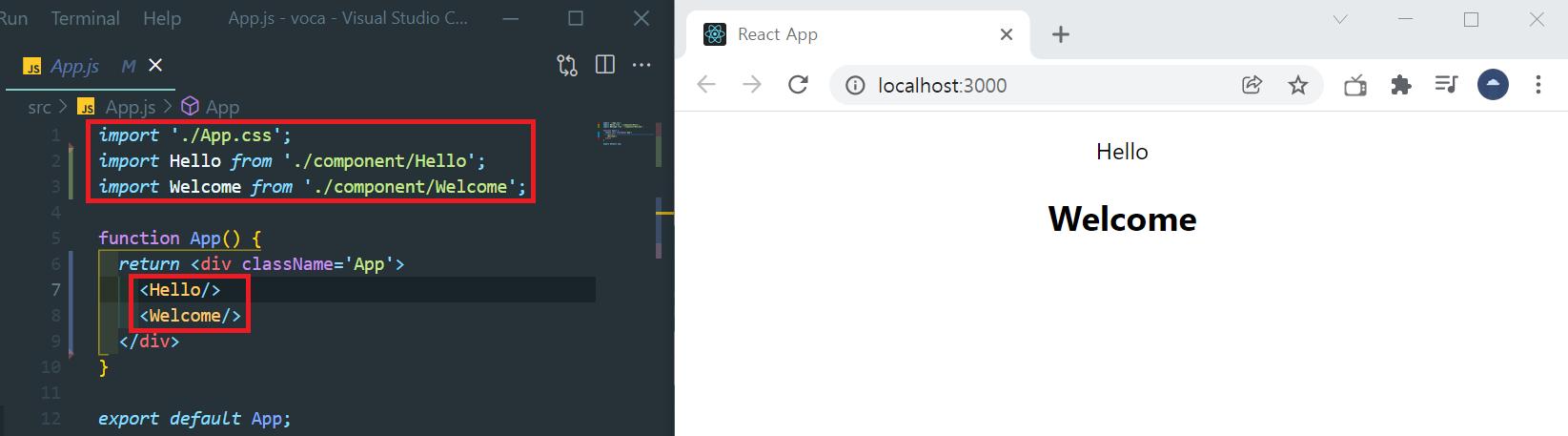 App.js에서 컴포넌트들을 import하고 html 태그처럼 원하는 위치에 적어주면 된다.