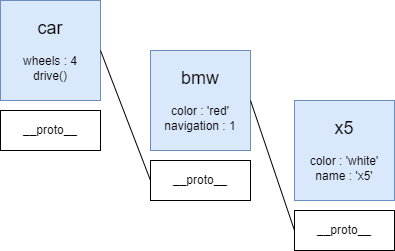x5.navigation을 입력하면 x5에서 navigation을 찾고, 없으니까 x5의 프로토타입인 bmw에서 탐색한다. 이곳에도 없으면까 bmw의 프로토타입인 car에서 탐색해서 찾는다. 이것을 Prototype Chain이라고 한다.
