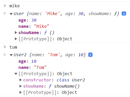 mike는 객체 내부에 showName이 있고, tom은 프로토타입 내부에 showName이 있는 것을 확인할 수 있다.