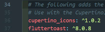 Toast message를 구현하려면 fluttertoast라는 라이브러리를 import 해야 한다. 기본적으로 내장되어 있는 flutter/material.darg 라이브러리 파일과 달리 fluttertoast 라이브러리는 따로 등록을 해서 불러오는 과정을 거쳐야 한다.