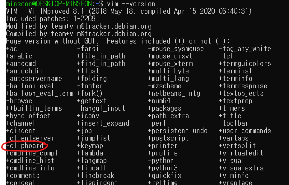 복사 붙여넣기를 가능하게 하기 위해서는 먼저 클립보드를 지원하는 vim version인지 확인해보아야 한다.