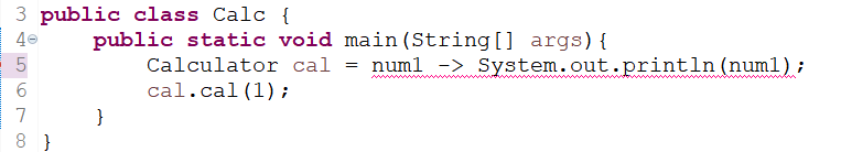 만약 Calculator 인터페이스의 cal() 메소드에 매개변수가 없다면 위와 같이 매개변수를 생략하여 작성할 수 있다.