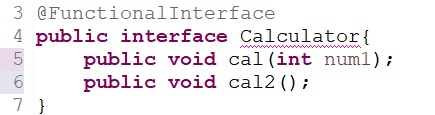 람다식으로 표현하기 위해 사용될 interface 위에 @FunctionalInterface만 붙여주면 컴파일 타임에 알아서 에러를 잡아준다. 위 사진에서 Interface에 메소드를 2개 작성하여 에러가 표시된 것을 알 수 있다.