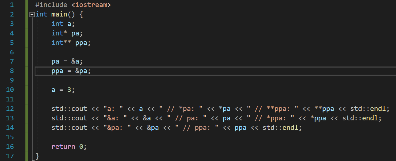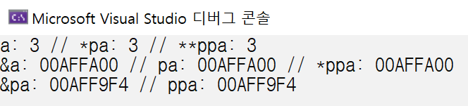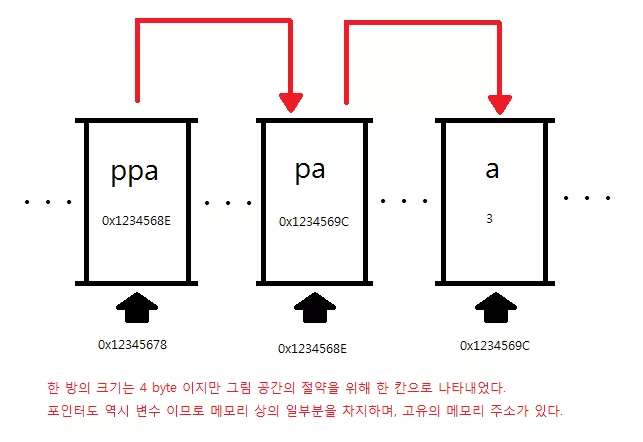 같은 행에 있는 값들이 모두 같다. (세번째 줄)ppa에는 pa의 주소값이 들어간다. 따라서 &pa와 ppa는 같은 값이다. (두번째 줄)pa가 a를 가리키고 있으므로 pa에는 a의 주소값이 들어간다. 따라서 &a와 pa는 같은 값이고, ppa가 pa를 가리키고 있으므로 *ppa를 하면 pa를 지칭하는 것이 된다. (첫번째 줄)pa가 a를 가리키고 있으므로 *pa를 하면 a를 지칭하는 것이 되어 a의 값이 출력된다. **ppa를 다시 써보면 *(*ppa)가 되는데 *ppa는 pa를 지칭하는 것이기 때문에 *pa가 되서 a를 지칭하는 것이 된다.