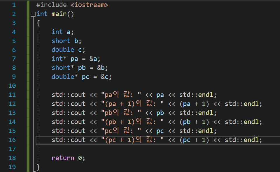 pa의 경우 4가 더해졌고, pb의 경우 2가 더해졌고, pc의 경우 8이 더해졌다. 포인터가 가리키는 형의 크기만큼 더해졌다.