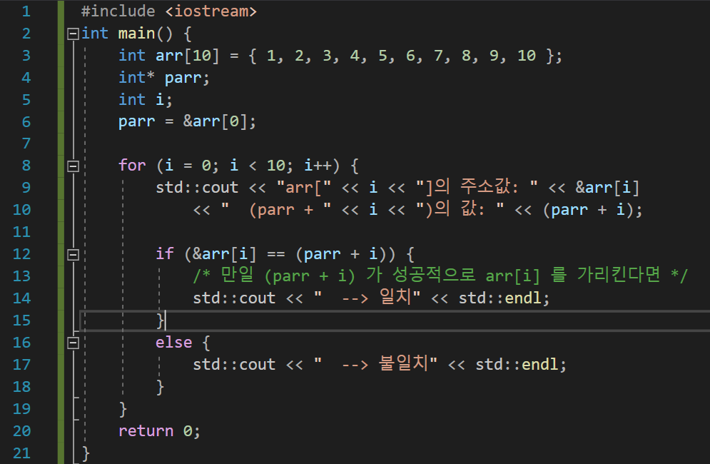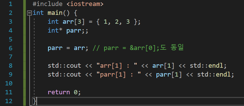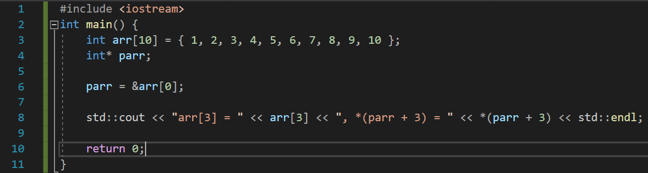 *를 이용하여 원소들과 똑같을 역할을 할 수 있게 된다. C++에서 []라는 연산자가 쓰이면 자동으로 형태를 바꾸어 처리한다. arr[3]이라 사용한 것은 컴파일러가 *(parr + 3)으로 바꿔서 처리한다는 뜻이다.