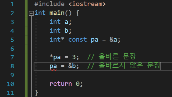 const 키워드가 int* 앞에 있는 것이 아니라 int*와 pa 사이에 놓이고 있다. pa 값이 바뀌면 안된다는 의미이다. 즉, pa가 처음에 가리키는 것(a) 말고 다른 것은 절대로 가리킬 수 없다는 것이다.