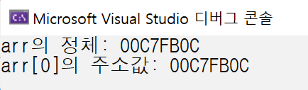 arr과 arr[0]의 주소값이 동일하다. 따라서 배열 이름은 배열의 첫 번째 원소의 주소값을 나타내고 있다는 사실을 알 수 있다. 그러나 배열 이름은 배열의 첫 번째 원소를 가리키는 포인터가 아니다.