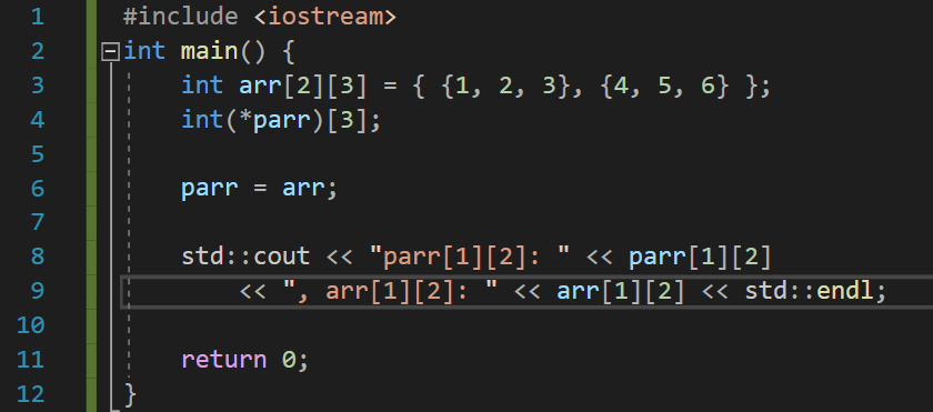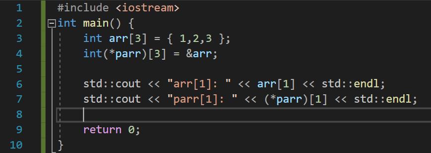 arr이 크기가 3인 배열이기 때문에, &arr을 보관할 데이터는 크기가 3인 배열을 가리키는 포인터가 되어야 한다. parr을 정의할 때 *parr을 꼭 ()로 감싸야 하는데, 만약 괄호를 빼버린다면 int *parr[3]와 같이 되어서 컴파일러가 int* 원소 3개를 가지는 배열을 정의한 것으로 오해하게 된다. parr은 크기가 3인 배열을 가리키는 포인터이기 때문에 배열을 직접 나타내기 위해서는 * 연산자를 통해 원래의 arr을 참조해야 한다. 따라서 (*parr)[1]과 arr[1]은 같은 문장이 된다.
