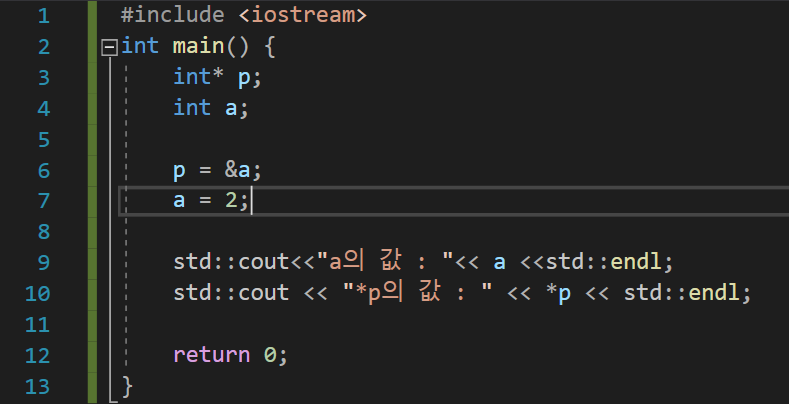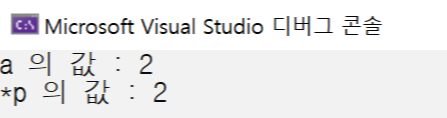위 코드에서 포인터 p에 a의 주소를 집어 넣고 a에 2를 대입하였다. *p는 통해 p에 저장된 주소(변수 a의 주소)에 해당하는 데이터, 즉 변수 a 그 자체를 의미한다.