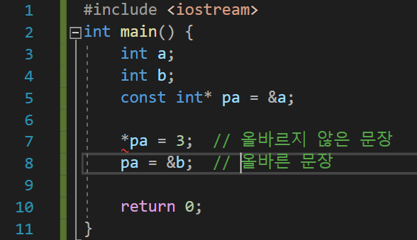 const int*의 의미는 const int형 변수를 가리킨다는 것이 아니다. int형 변수를 가리키는데 그 값을 절대로 바꾸지 말라는 의미이다. pa는 int형 변수를 가리키고 있는데, const가 붙었으므로 pa가 가리키는 변수의 값은 절대 바뀌면 안된다.
