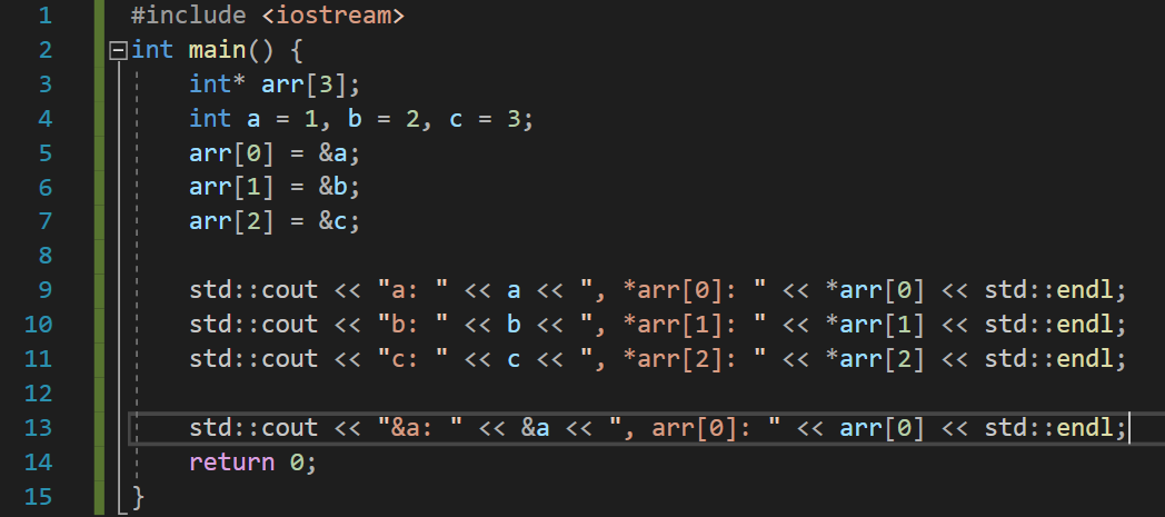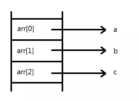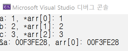 배열의 형을 int*로 했다. 다시 말해, 배열의 각 원소는 int를 가리키는 포인터형으로 선언된 것이다. 따라서 배열에 각 원소의 주소값이 들어간다. 각각의 원소는 int형 변수 a, b, c를 가리키게 된다.