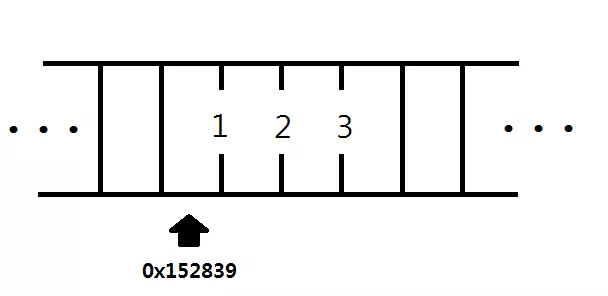 0x152839는 이 방의 시작 주소이다. 16진수로 152839라는 위치에서부터 4바이트 공간을 차지하며 123이라는 값이 저장되어 있게 하라는 뜻이다.