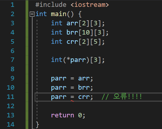 위와 같이 정의한 포인터 parr을 해석해 보면, int형 이차원 배열을 가리키는데 배열 한 행의 길이가 3이라는 사실을 알 수 있다. parr은 사실 크기가 3인 배열을 가리키는 포인터를 의미한다. 1차원 배열에서 배열의 이름이 첫 번째 원소를 가리키는 포인터로 타입 변환이 되는 것처럼, 2차원 배열에서 배열의 이름이 첫 번째 행을 가리키는 포인터로 타입 변환 되어야 한다. 그 첫 번째 행은 크기가 3인 1차원 배열이다!