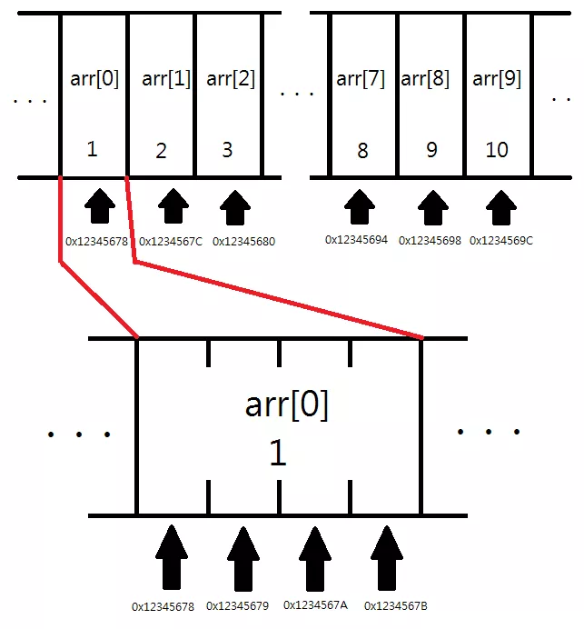 int arr[10] 라는 배열에서 x번째 원소의 주소값을 알아내는 방법을 생각해보자. 이 배열의 시작주소를 arr이라 한다면 arr[x]의 주소값은 arr + 4x 와 같이 나타낼 수 있다.