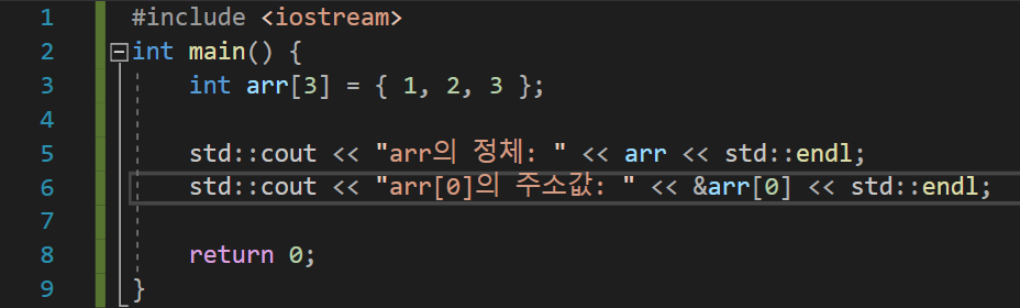 &arr에서 주소값 연산자가 왔으므로 암묵적 변환이 이루어지지 않는다.
