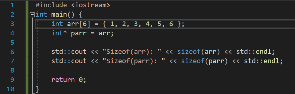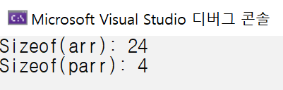 sizeof 는 크기를 알려주는 연산자이다. arr에 sizeof 연산자를 사용하였을 경우 배열의 실제 크기가 나온다. arr 배열에는 int 원소 6개가 있으므로 크기는 24가 된다. 반면 parr에 sizeof 연산자를 사용하였을 경우 배열 자체의 크기가 아니라 포인터의 크기를 알려 준다. 배열의 이름과, 첫 번째 원소의 주소값은 엄밀히 다른 것이다.