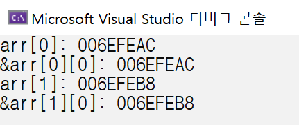 arr[0]의 값이 arr[0][0]의 주소값과 같고 arr[1]의 값이 arr[1][0]의 주소값과 같다. 이를 통해 알 수 있는 사실은 1차원 배열과 마찬가지로 sizeof나 주소값 연산자로 사용되지 않을 경우, arr[0]은 arr[0][0]을 가리키는 포인터로 암묵적 타입 변환되고, arr[1]은 arr[1][0]을 가리키는 포인터로 타입 변환된다는 뜻이다.