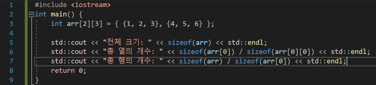 따라서 sizeof를 사용하였을 경우 2차원 배열의 열의 개수를 계산할 수 있다.