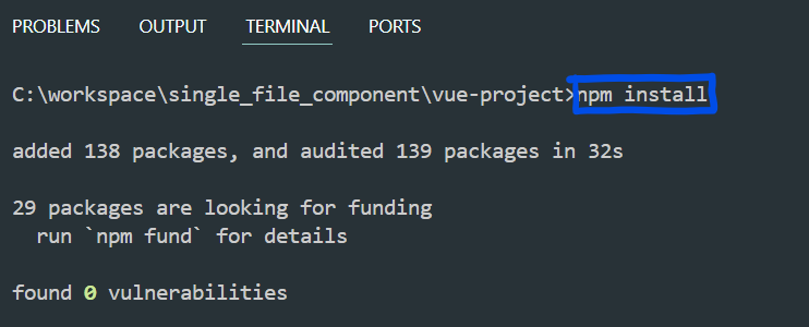 5. vs code에서 터미널을 열고 npm install 명령어로 npm을 설치한다.