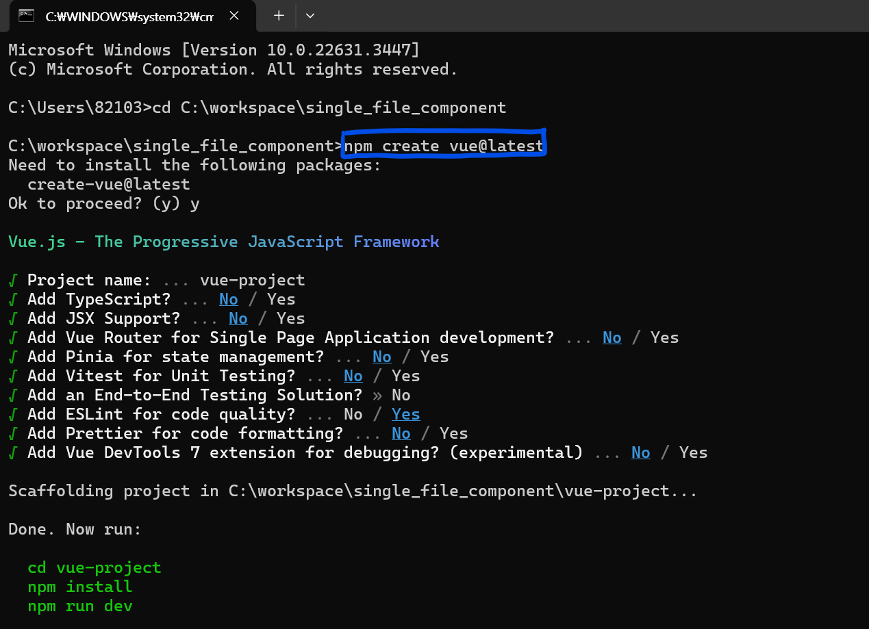 3. npm create vue@latest 명령어를 입력하고 프로젝트 이름과 옵션을 선택하면 프로젝트가 생성된다.