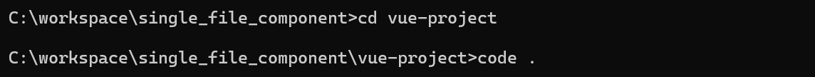 4. 프로젝트 폴더로 이동하여 code . 명령어로 vs code를 실행한다.